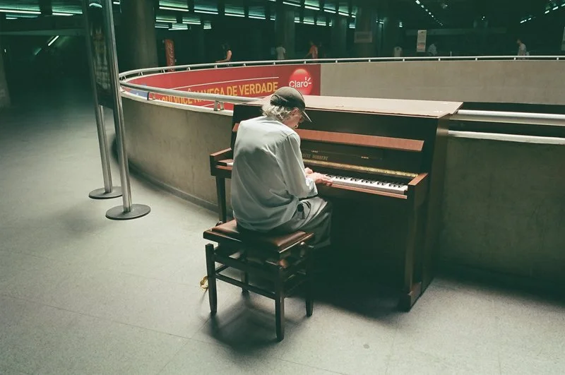 Entré en la estación Sé, la más movida de todas las estaciones, lo vi a este señor sentado en el piano público, me encanta que haya un piano público en el atrio de la estación y que la gente lo pueda tocar, escuchar. Fue un momento de silencio en el caos. Ojalá pudiera haberme quedado ahí un rato más, pero debía seguir.