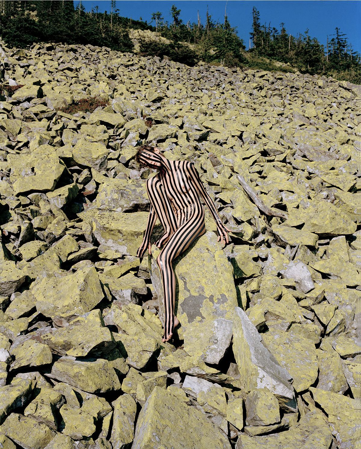 I do not see a naked painted woman and a landscape in your photographs, I most see one completed scenario where one needs for the other to complete a meaning, like a one second performance, but please tell me how do you work. It seems you take the camera and travel around the globe to see where is the place, but your process of creating a picture is still unreachable for me. Would you tell me about your process of work?